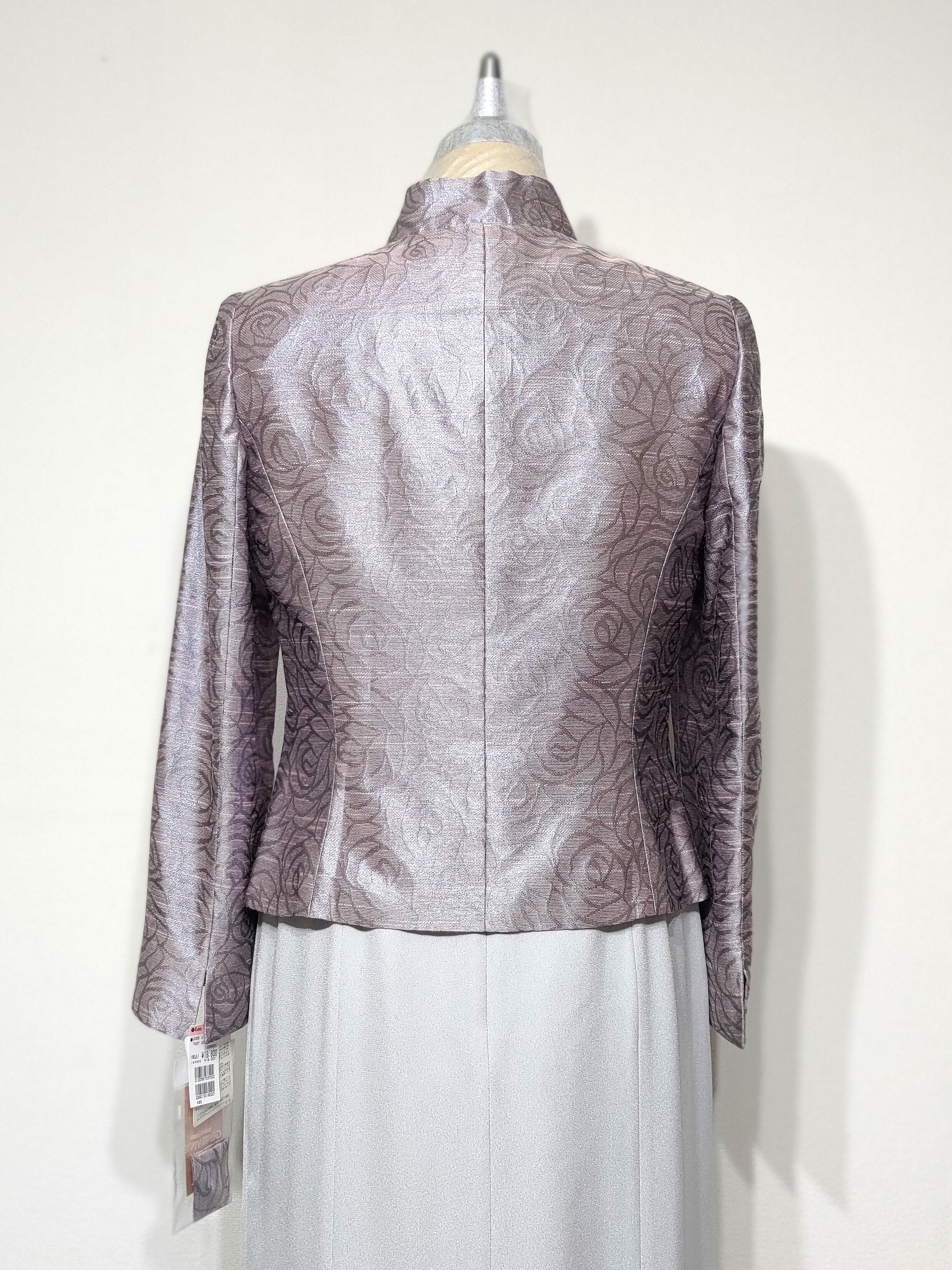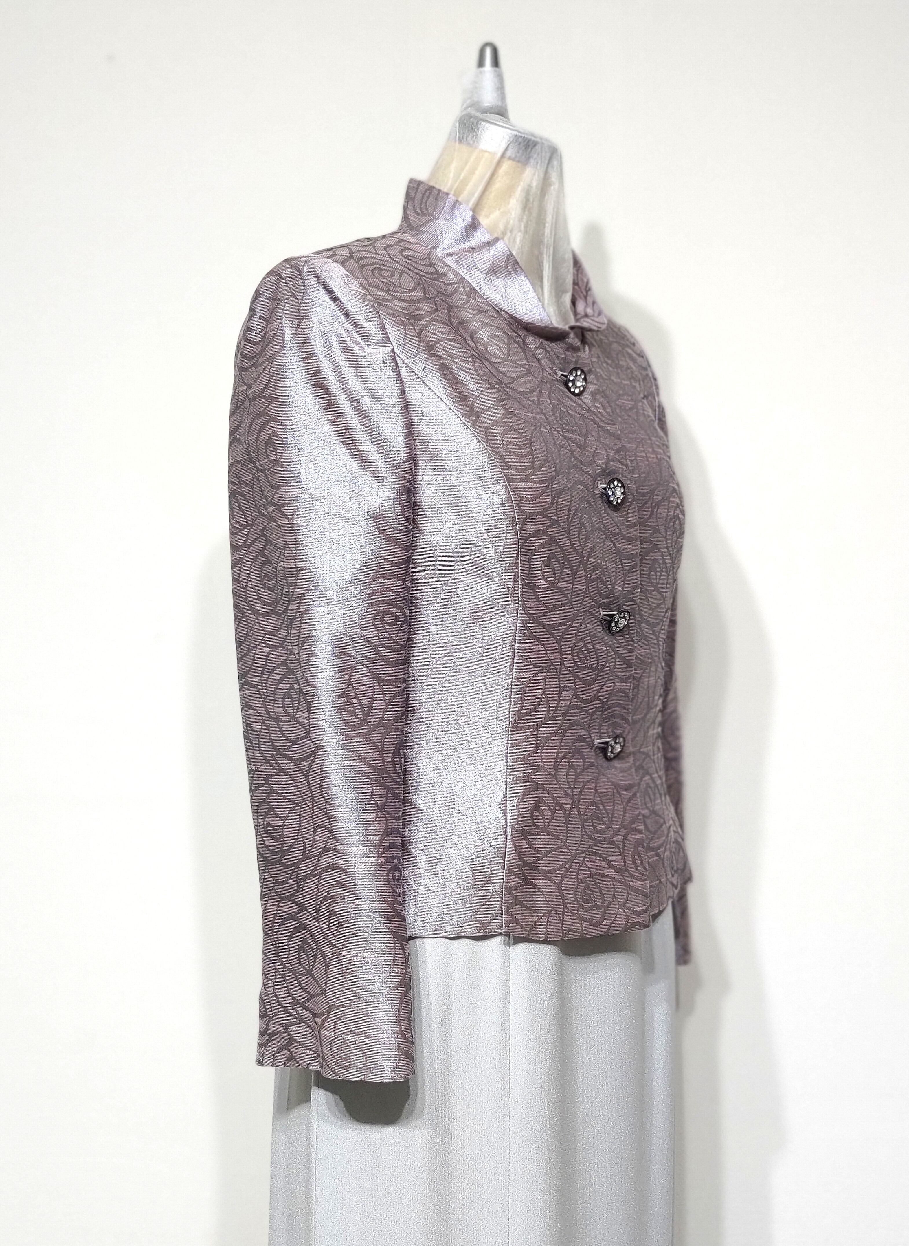 スタイリッシュなデザインと高級感溢れる素材が特徴のスタンドカラーラメジャガードジャケットです。このジャケットは、華やかなラメ仕上げのジャガード生地を使用しており、豊かな質感が特別なシーンを演出します。シンプルなスタンドカラーが洗練された印象を与え、どんなコーディネートにもマッチする。上品なピンクの色合いが肌に映え、デイリースタイルからフォーマルな場面まで幅広く活躍いたします。