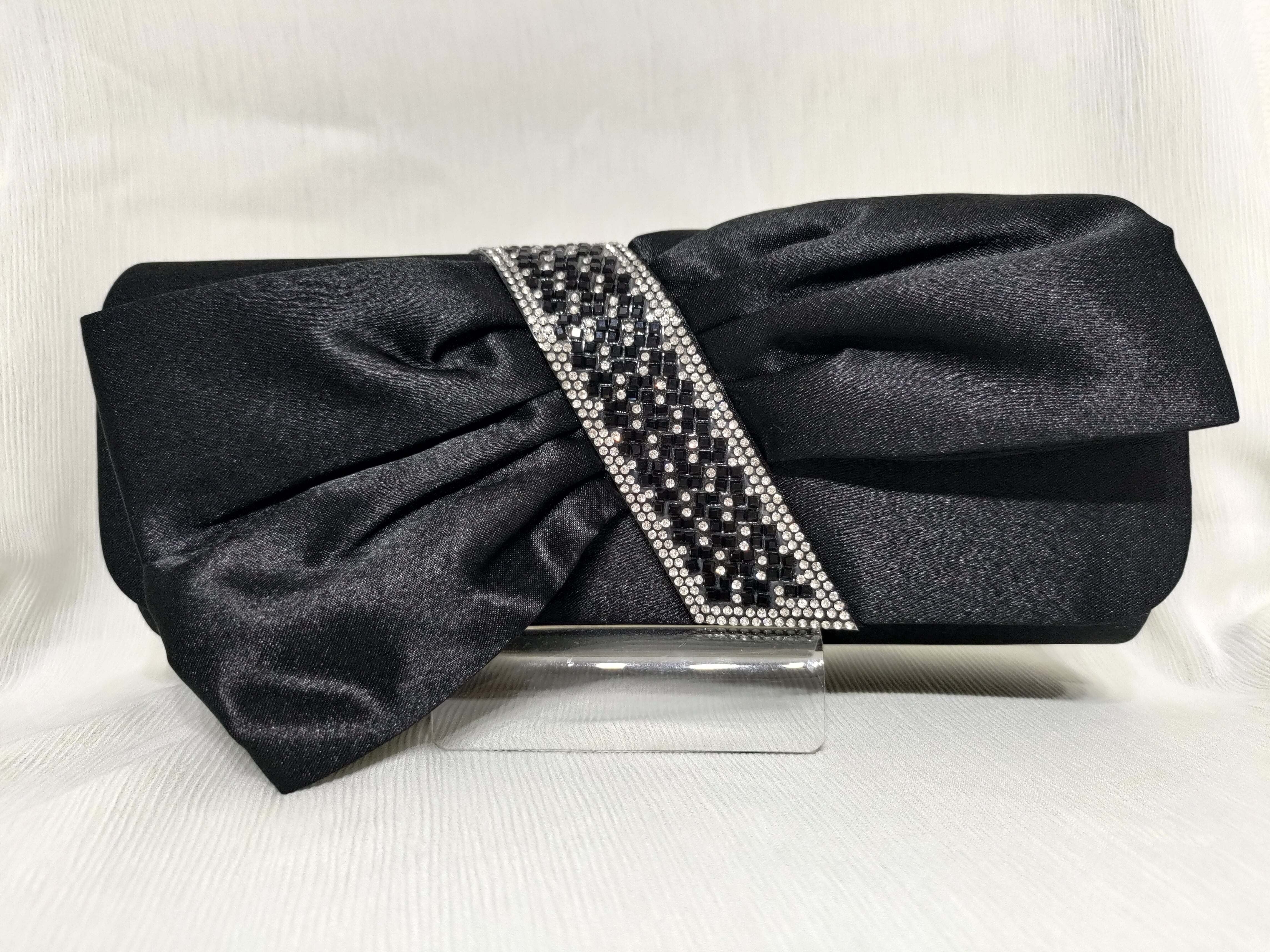 華やかなリボンが特徴のサテンクラッチバッグです。このバッグは、シンプルでありながら洗練されたデザインが魅力で、パーティーや特別なイベントにぴったりのアイテムとなっています。