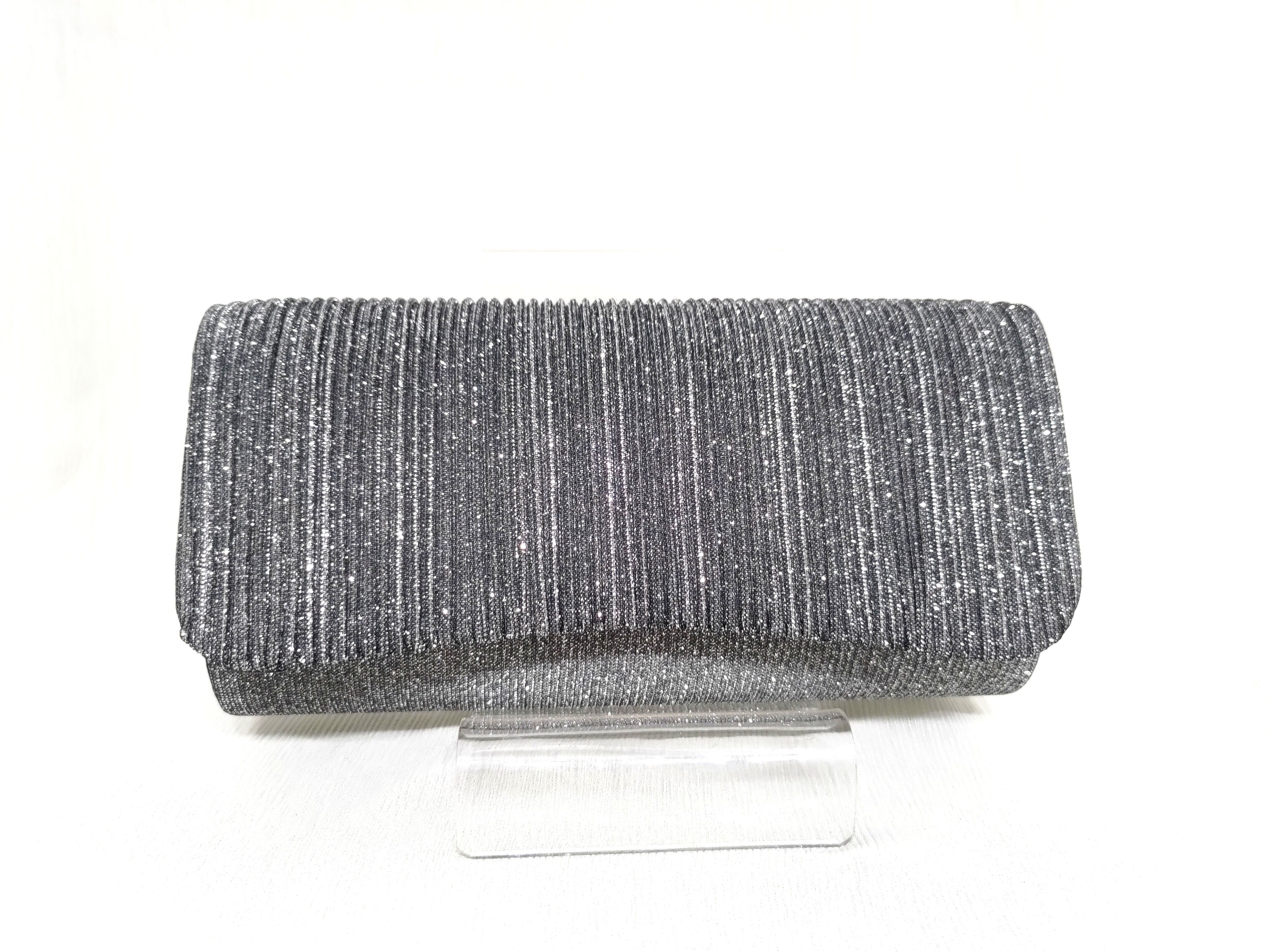 プリーツ風デザインが特徴のメタリッククラッチバッグです。このやや小さめのバッグは、持ち運びに便利で、パーティーやお出かけの際に最適なアイテムです。シンプルながらも洗練された雰囲気を醸し出し、さまざまなスタイルに馴染むことでしょう。